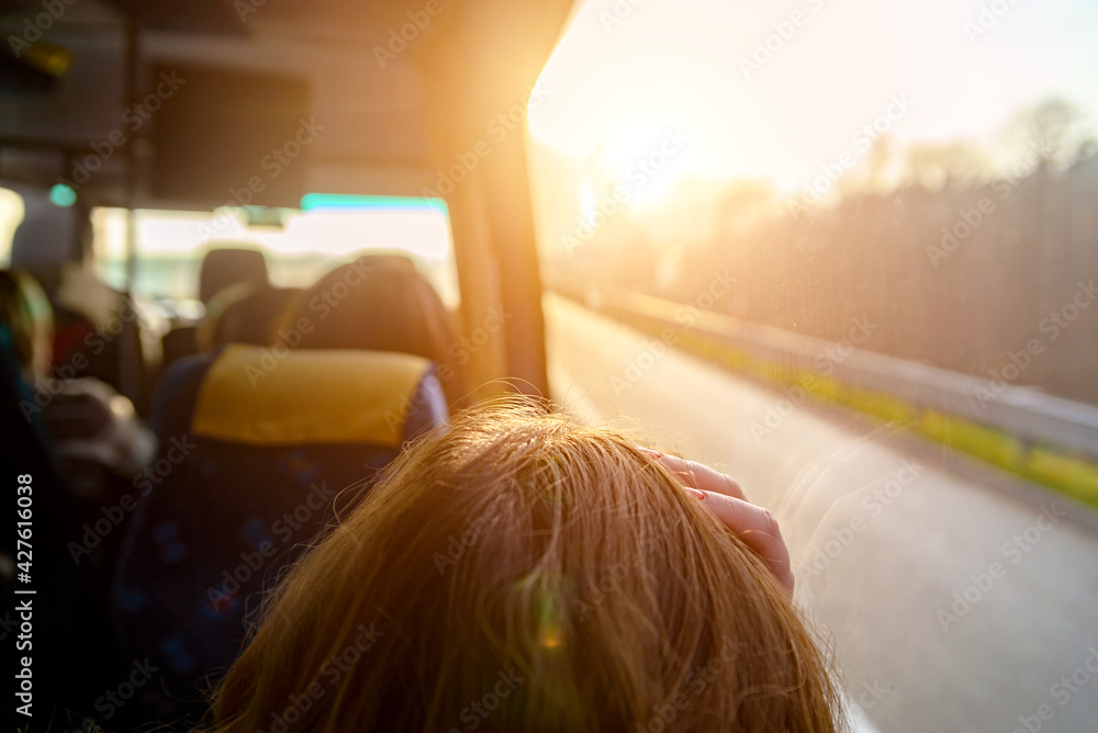 Passengers travel by bus on a sunny morning. Focus on the crown of the head