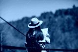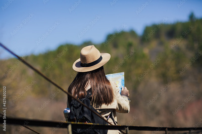 Tourist woman with hat and backpack uses paper map traveling through a mountains.
