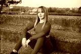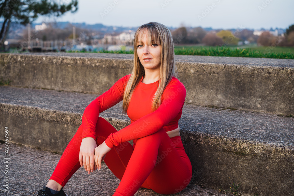 Portrait of a smiling confident fitness woman in red sport wear resting after work out or running outdoors on sunset. Jogging in the stadium. Active lifestyle and health care. Copy space.