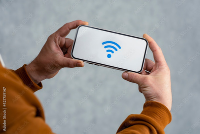 Man hand holding silver smartphone isolated on light background. Phone mockup with white screen and wi-fi icon.