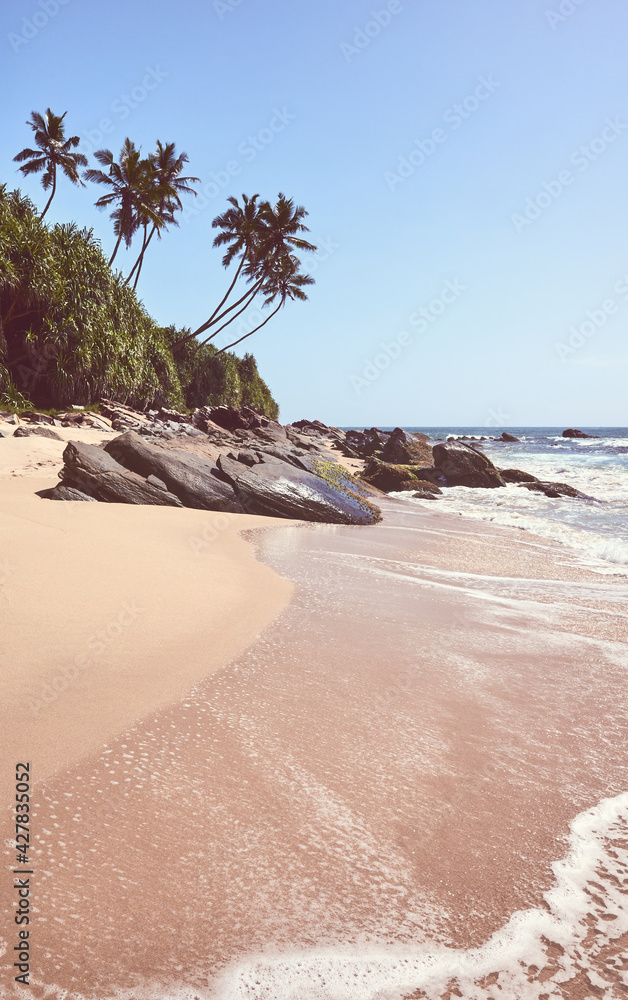 Wide sandy tropical beach on a beautiful sunny day, color toning applied, Sri Lanka.