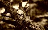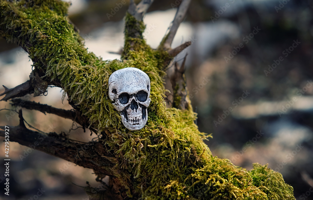 Human skull occult amulet in dark mystical forest. Black magic esoteric ritual. Mysticism, divination, wicca, occultism, Witchcraft concept