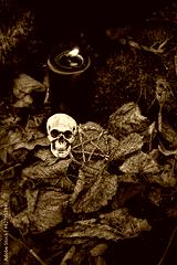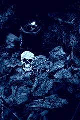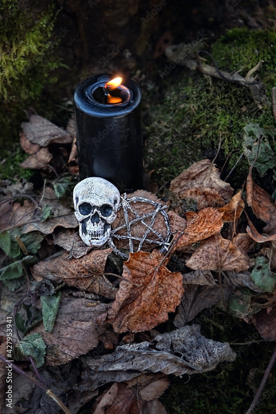 Black candle, Human skull occult amulet, pentagram in dark mystical autumn forest. Black magic esoteric ritual. Mysticism, divination, wicca, occultism, Witchcraft concept