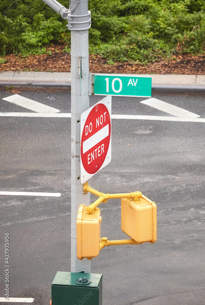 Do not enter traffic sign on the 10 Avenue in New York City, selective focus, USA.
