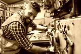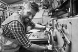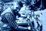 Arbeiter in Metallfabrik bedient Standbohrmaschine