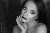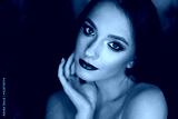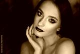 Close up beauty portrait of a brunette girl with brown eyes, professional evening make-up, dark lipstick, smoky eyes in a gold corset. A festive image for a party. Silver dark background. Copy space