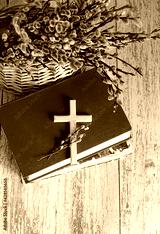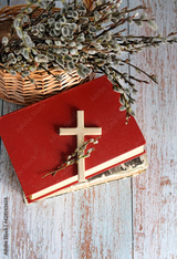 Christianity cross, bible books and willow branches. Orthodox palm Sunday holiday, Easter, spring season. symbol of faith and prayer. flat lay, top view