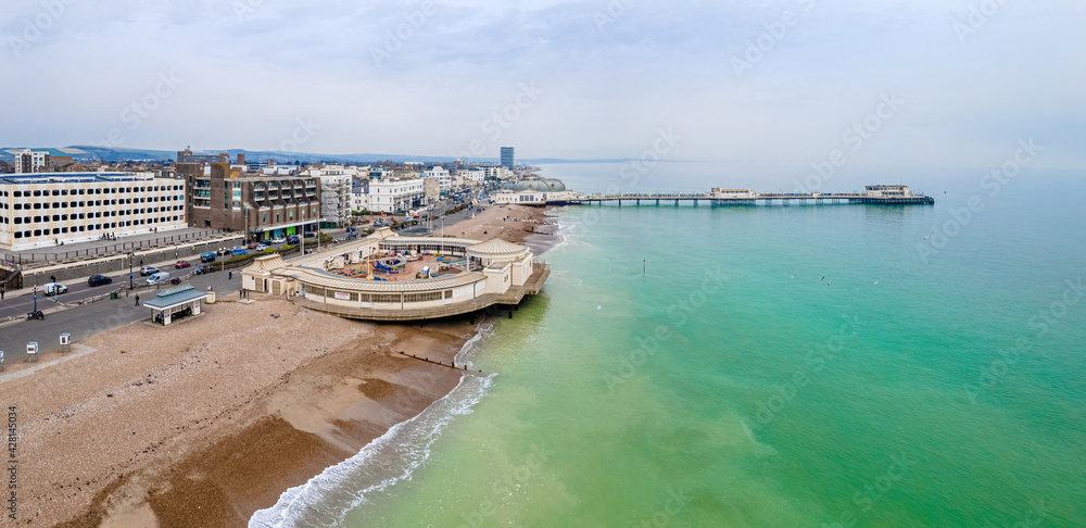 An aerial view of Worthing Pier, a public pleasure pier in Worthing, West Sussex, England