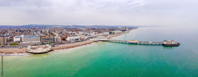 An aerial view of Worthing Pier, a public pleasure pier in Worthing, West Sussex, England