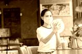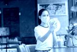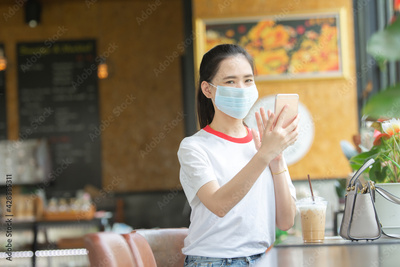 Asian women wear face mask sitting in coffee cafe and using phone looking the New Measures to control the epidemic of COVID 19