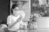 Asian women wear medical mask and using mobile phone sitting in coffee cafe , Women wear mask prevent coronavirus covid19 for Outbreak control measures