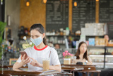 Asian women wear medical mask and using mobile phone sitting in coffee cafe , Women wear mask prevent coronavirus covid19 for Outbreak control measures