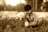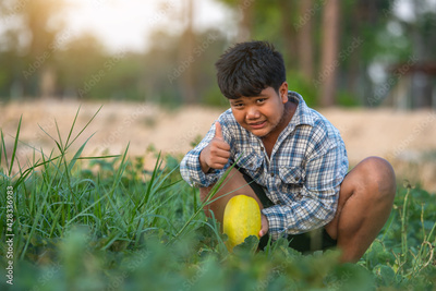 A boy with a melon in the field Quality selection for consumers, Kid smile with melon in farm
