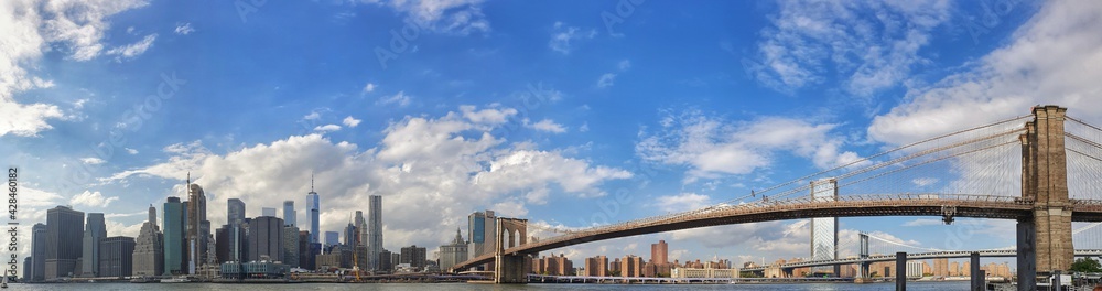 A beautiful panoramic photo of New York city skyline on sunshine day with beautiful blue clear sky.