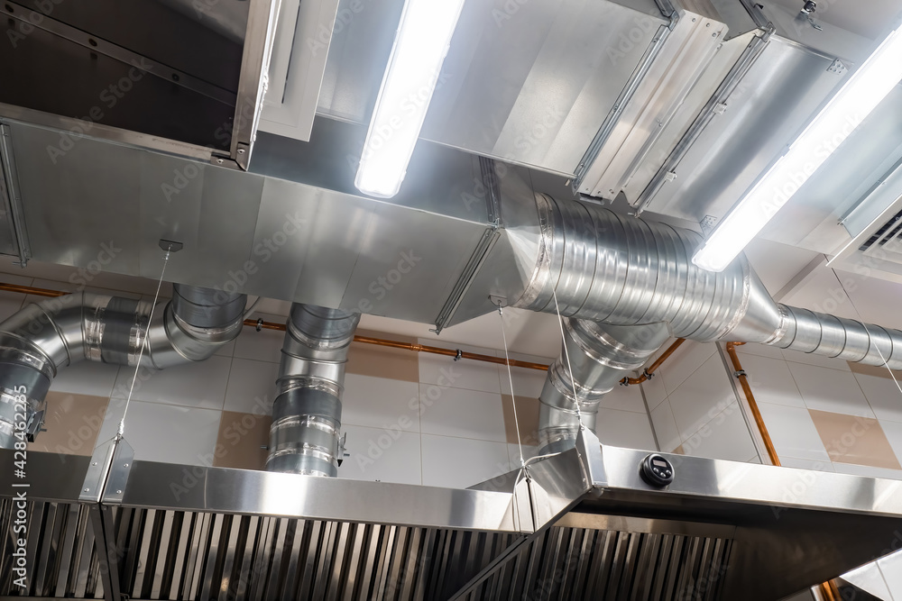 Ventilation pipes in silver insulation material. Chromed pipes hanging from ceiling inside premises. Concept is a restaurant exhaust system. Several hoods in room, bottom view. Ventilation system