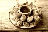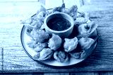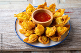 Deep fired Chinese Thai style wonton with minced pork and sweet and sour sauce in ceramic dish.