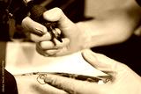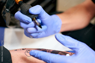 the hands in blue gloves of a tattoo artist doing a tattoo on the leg of a male in a studio