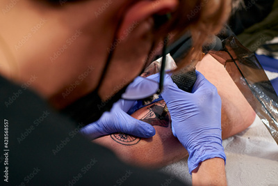 the tattoo artist in blue gloves doing a tattoo on the leg of a male in a studio