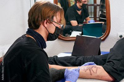 the tattoo artist in blue gloves cleaning the newly completed tattoo on a man's leg