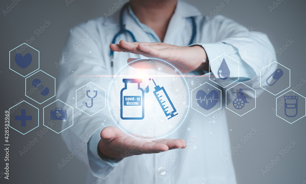 Doctor showing Corona virus 19 vaccine and syringe icon with health care icon , Distribution COVID-19 vaccine to stop pandemic concept.