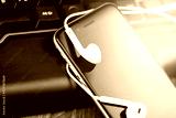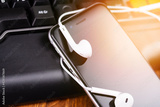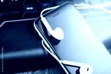 Smartphone and headphones on a laptop keyboard. Clubhouse is an audio chat app