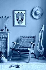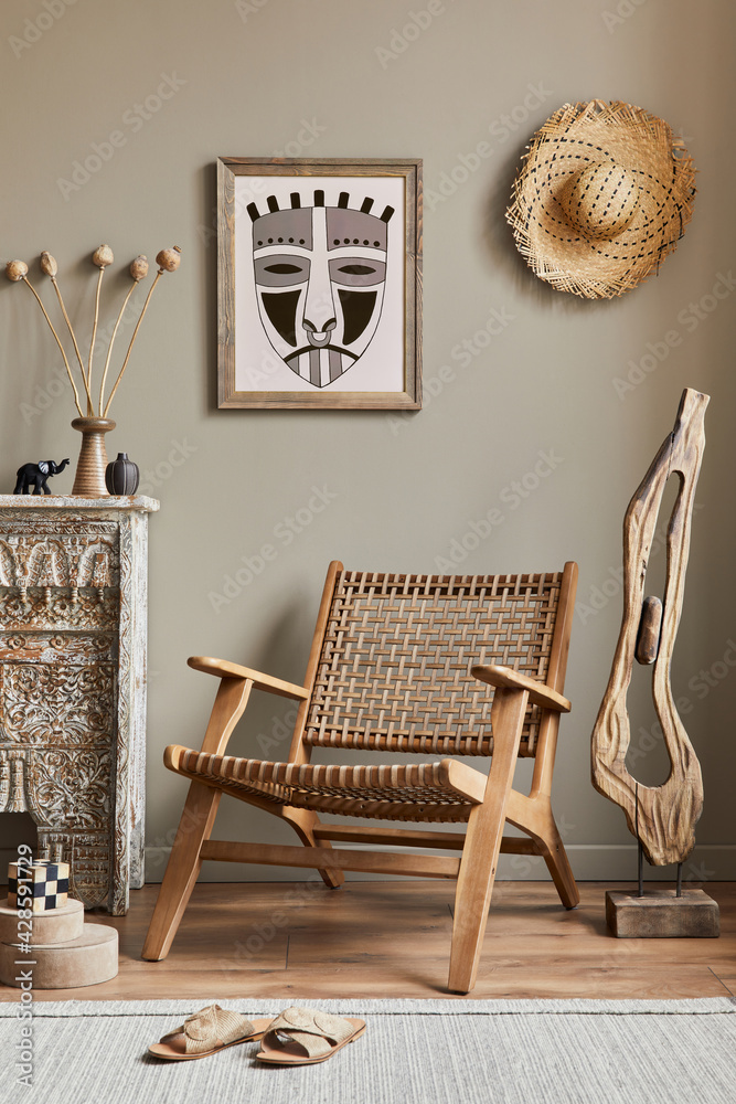 Fancy mediterranean interior of living room with mock up poster frame, design armchair, shelf, decoration, carpet and elegant personal accessories in stylish home decor. Template.