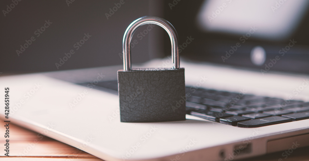 Lock on laptop as computer protection and cyber safety