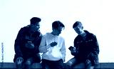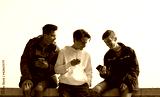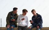 A closeup of three young Caucasian and Hispanic guys socializing and using their smartphones
