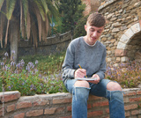 A vertical shot of a cheerful stylish Caucasian guy sitting in a garden doing his homework
