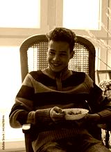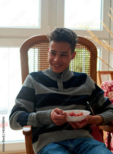 A vertical shot of a cheerful young Hispanic guy sitting holding a bowl of fresh strawberries