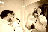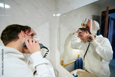 A panoramic shot of a young Caucasian guy shaving in the bathroom with an electric shaver