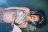 Beautiful pregnant woman floating in tank filled with dense salt water used in meditation, therapy, and alternative medicine.