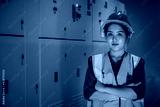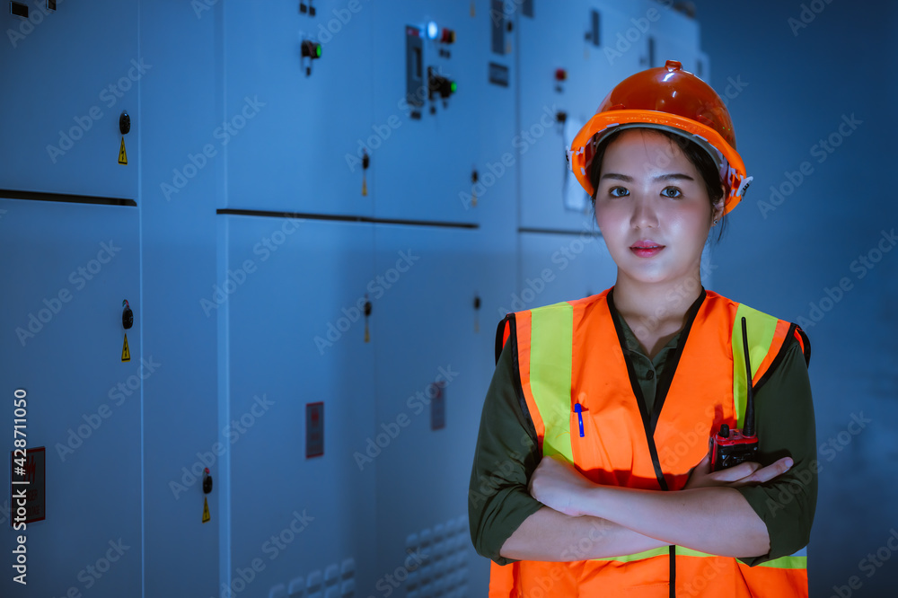 Portrait engineer pose checking and inspecting with radio communication at MDB panel .she working with electric switchboard to check range of voltage working in Main Distribution Boards