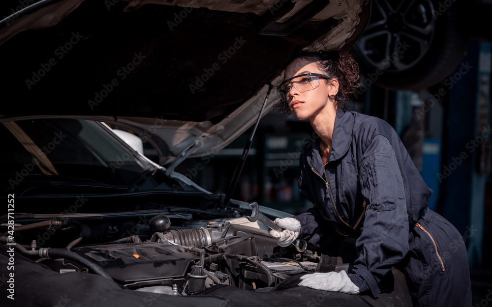 Car mechanic open car hood repairs and check problem system to maintenance and fixed in garage .she wearing glass and uniform in work.