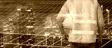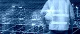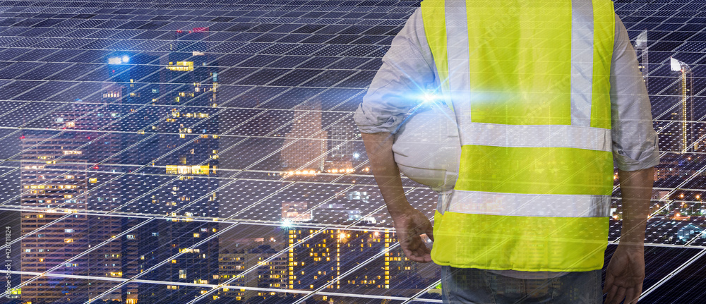 Double exposer worker wearing safety uniform and helmet hardhat work with show solar cell ecology power and night city scape background.