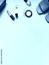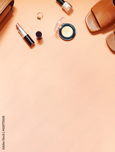 Summer fashion accessories, shoes and make up on the beige background. Lifestyle concept flat lay. Copy space