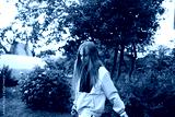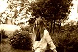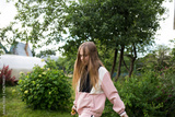 child in tracksuit jumps on rope in garden. girl plays sports in summer outdoors. activity for people.