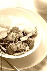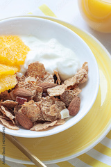 Whole grain oats and wheat flakes with orange, almond nuts and yogurt in a white bowl. Healthy morning breakfast concept close up