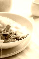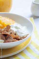 Whole grain oats and wheat flakes with orange, almond nuts and yogurt in a white bowl. Healthy morning breakfast concept close up
