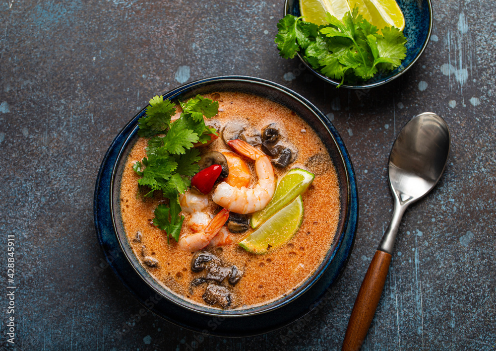 Traditional spicy Thai soup Tom Yum with shrimp and seafood in ceramic bowl on blue stone rustic background from above, classic dish of cuisine of Thailand