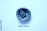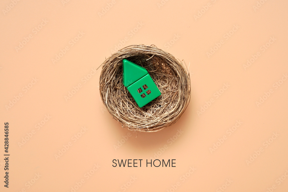 Green house in the nest and the inscription: sweet home. A symbol of protection and care for the home and family