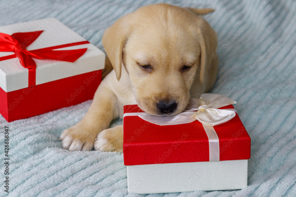Small cute labrador retriever puppy dog with gift boxes on a bed