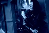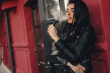 Beautiful stylish brunette smoking an e-cigarette as she is walkind through the city. Vaping concept. Trendy new vaping device, smoke e-liquid instead of nicotine cigarettes.