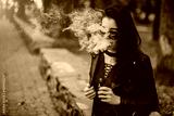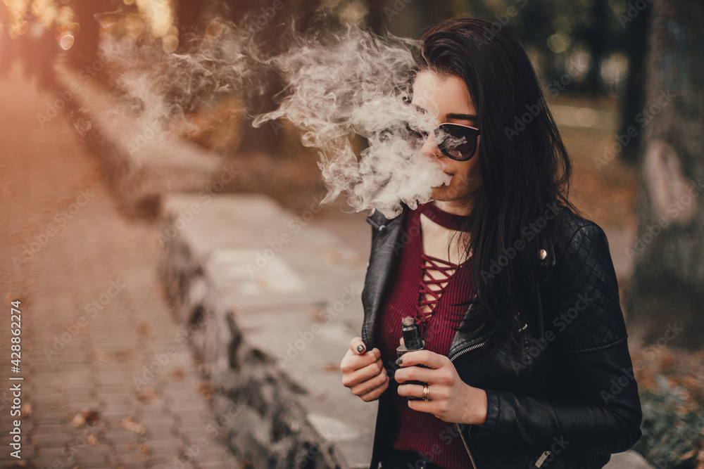Beautiful stylish brunette smoking an e-cigarette as she is walkind through park. Vaping concept. Trendy new vaping device, smoke e-liquid instead of nicotine cigarettes.