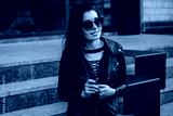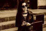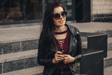 Beautiful stylish brunette with e-cigarette. Vaping concept.
