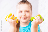 A fair-haired child without a milk tooth plays with purple mucus. Little beautiful caucasian girl is playing with many slugs and smiling. Play Slime Toy