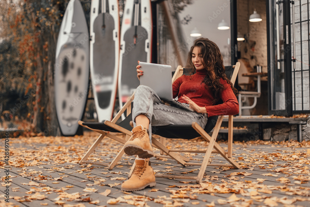 Beautiful woman in cozy outfit works at laptop while sitting on chair in autumn park.