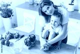 Son with mom are cutting vegetables on salad in kitchen and hugging. Happy family.