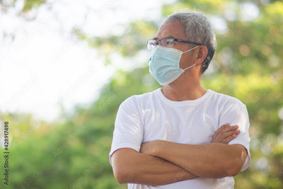 Old man wear surgical mask protect coronavirus covid19 at outdoor city park lifestyle new normal ,Retired man exercising in the morning