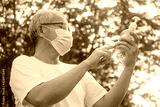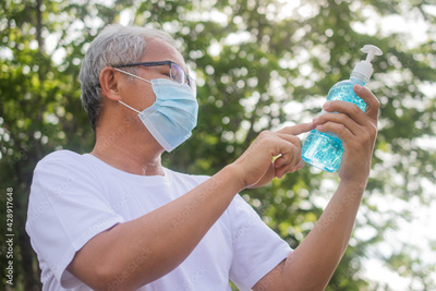 Old man wear medical mask and use alcohol gel protect coronavirus covid19 at outdoor city park